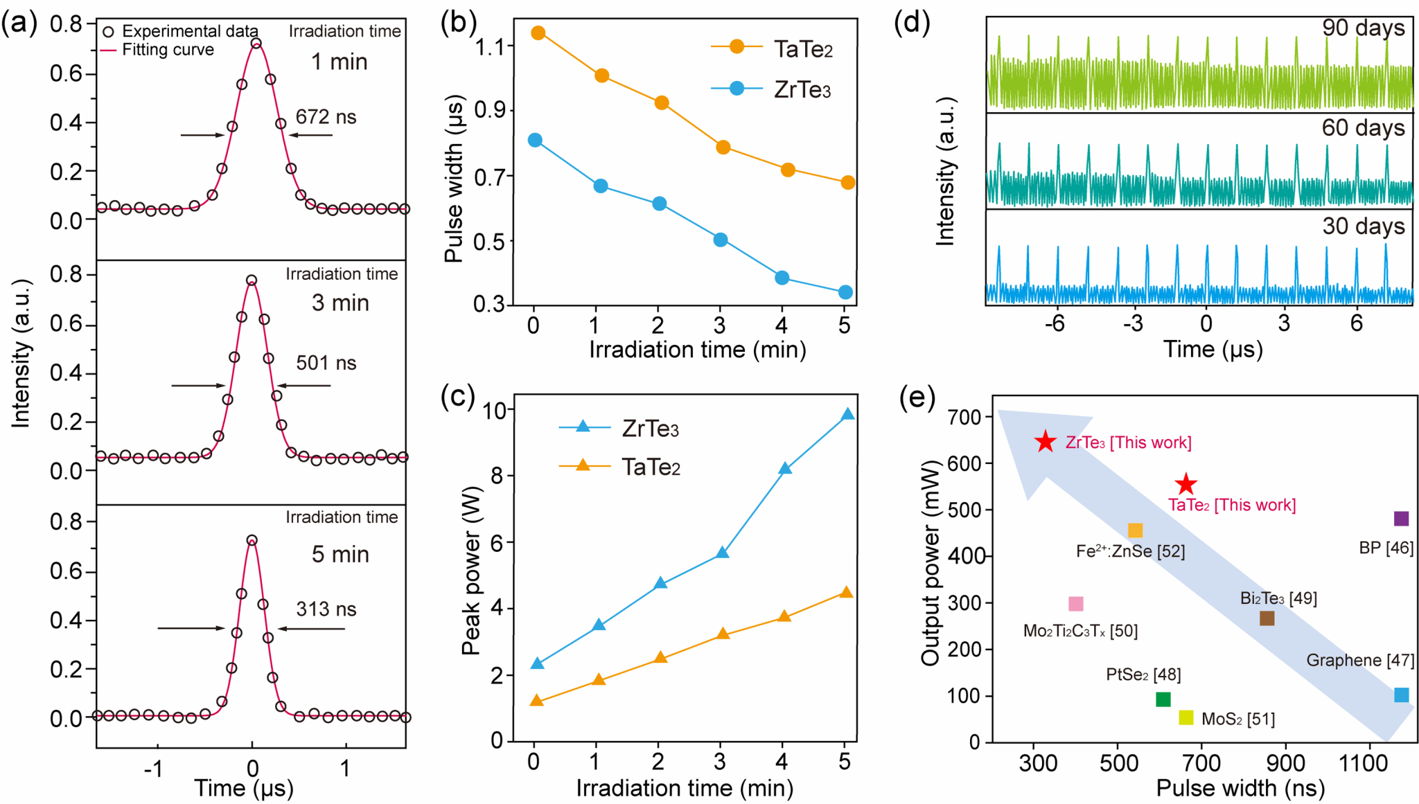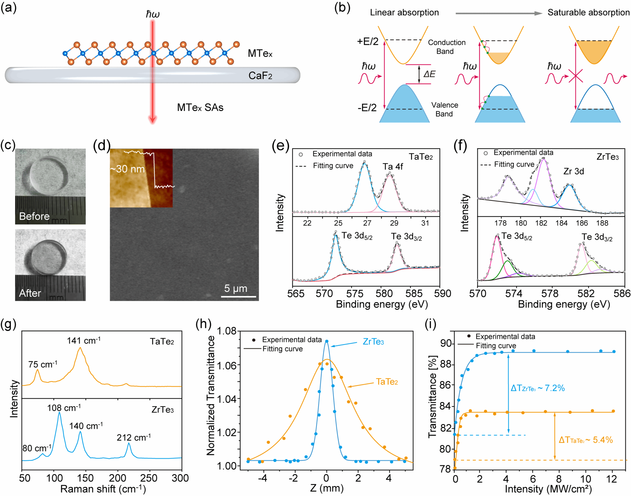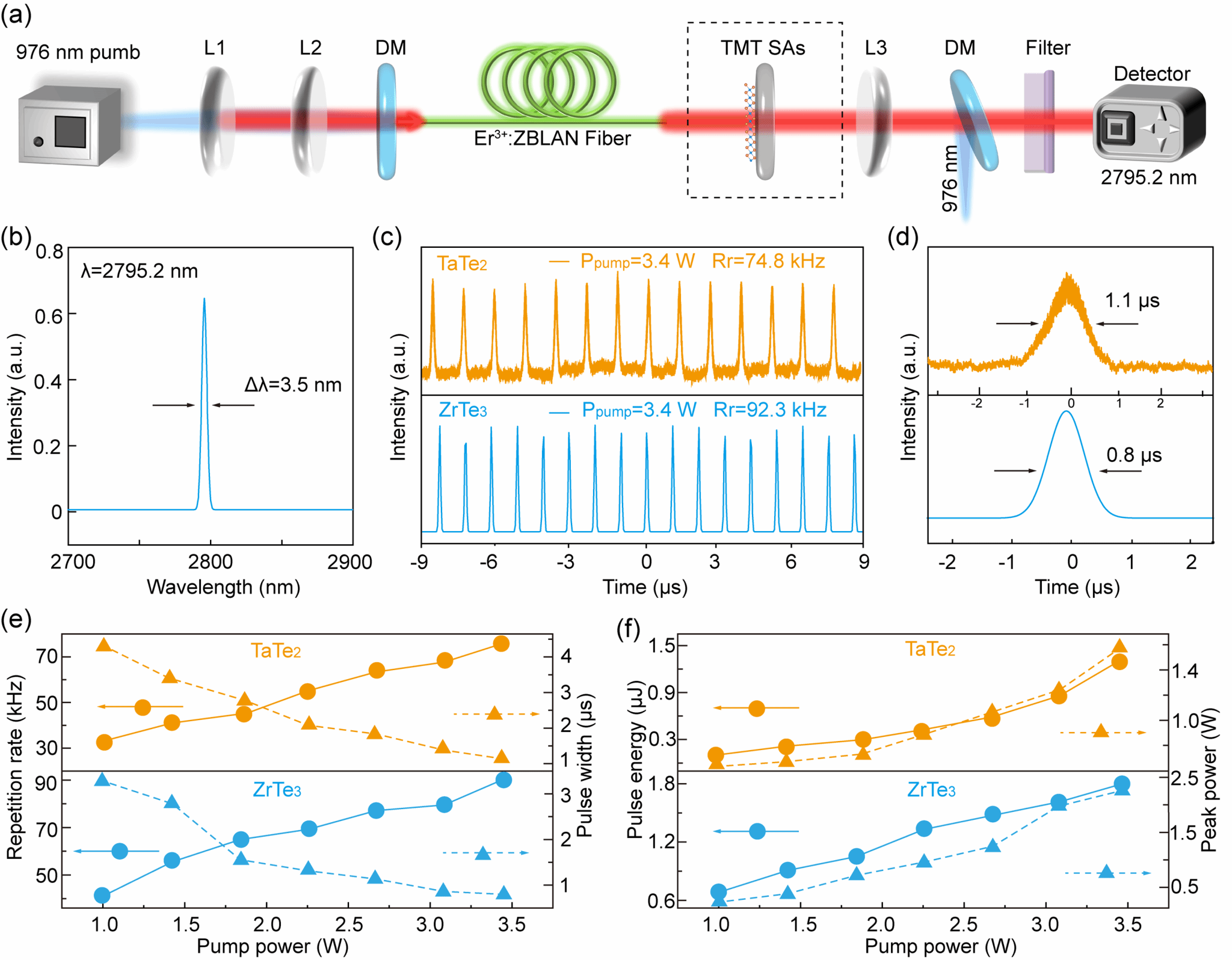 This study proposes a strategy for preparing high-performance 2D TMT-based SAs. The approach involves the in-situ growth of large-area, high-quality 2D ZrTe3 and TaTe2 thin films on CaF2 substrates, followed by oxygen plasma passivation treatment to form a dense and stable Zr/Ta oxide protective layer on the material surface. This oxide layer effectively isolates the material from corrosion and laser damage caused by ambient moisture and oxygen, thereby significantly improving the device’s stability and optical performance without introducing substantial loss to the mid-infrared laser. Experimental results show that the optimized ZrTe3 saturable absorber delivers a Q-switched pulse with a peak power of up to 9.92 W and a pulse width of 313 ns at ~3 μm. The TaTe2 saturable absorber achieves a peak power of 4.26 W with a reduced pulse width of 680 ns. Notably, the fabricated saturable absorbers retained stable Q-switched pulse output capability after being stored in air for three months, demonstrating excellent operational stability.